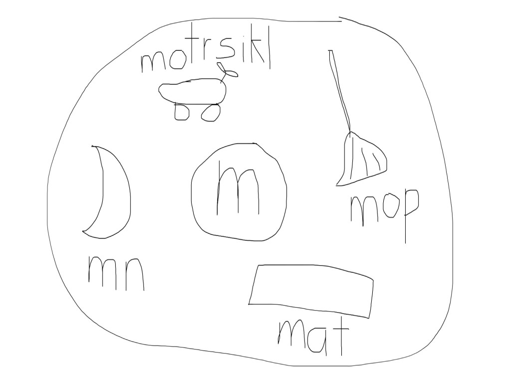 I would model how to figure out a word that started with the /mmmmm/ sound and draw and label it on my circle map by stretching the sounds out and writing them down. I would then ask them to tell me a word they would draw and label. They did the first one at the table with me (so I could assess) and finish two more independently before they went back to centers. Below are some examples.